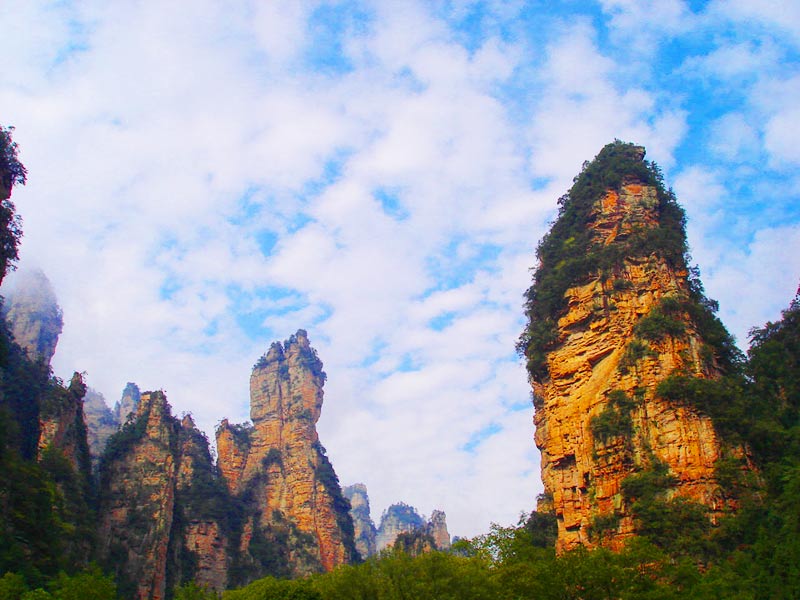 天門山國家森林公園四面絕壁,雄偉壯麗。保存著完整的原始次生林,植物資源豐富,有世界罕見的高山珙桐群落。天門山文化底蘊(yùn)深厚,留有大量贊詠天門山的詩詞,更有眾多神聞傳說,被譽(yù)為“張家界之魂”。山頂天門山寺自唐朝建成以來香火鼎盛,寺外有七級(jí)浮屠,掩映于青枝綠葉中,古雅幽清。善男信女入寺拜佛,撞鐘響徹天際,擊鼓震動(dòng)山岳,香煙裊裊如云。明萬歷年間南岳僧在此傳經(jīng)授戒,從此聞名遐邇,朝山拜佛者達(dá)周邊四郡十余縣,信士遍及湘西北,天門山因此成為 “湘西第一神山”。天門山終年云霧繚繞,云海景象變化無窮。山間溶丘、石芽廣布,奇石秀木及珍禽異獸繁多,更有飛瀑流泉噴涌而出。天門山兼峰、石、泉、溪、云、林于一體,集雄、奇、秀、險(xiǎn)、幽于一身,被譽(yù)為空中原始花園。天門洞、天縫渡仙、五指山、將軍石等是有名的峰林景觀,還有神秘的千佛洞等待你的探奇;山間的韓家溝則是富蘊(yùn)滿族風(fēng)情的村落——這里久居的幾十戶滿族農(nóng)家至今仍完好保留著其在語言、飲食、衣著、居住以及婚慶殯葬等方面的滿族風(fēng)俗,是難得的民俗文化旅游地。