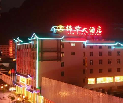 武陵源錦華大酒店是一家按國家四星級標(biāo)準(zhǔn)、2009年5月新修建成的豪華旅游度假酒店,地理位置優(yōu)越,位于武陵源汽車站旁.酒店集觀光旅游、度假、商務(wù)會議、品嘗土家美食等多功能為一體,酒店建筑融合張家界地區(qū)的民族風(fēng)情和建筑文化,是張家界地區(qū)最有土家風(fēng)情的星級酒店之一。 武陵源錦華大酒店安裝了數(shù)控中央空調(diào)系統(tǒng)、空氣源熱水系統(tǒng)。24小時供應(yīng)冷熱水。 武陵源錦華大酒店擁有客房100間,其中套房3間、標(biāo)準(zhǔn)間96間、單人間1間,客房內(nèi)配有液晶電視、閉路電視和寬帶接口;餐要包廂8個、豪華包相一個、極具當(dāng)?shù)靥厣摹盎鹂游荨卑鼛?個、中餐宴會廳可同時容納300人就餐。酒店還配備一個高標(biāo)準(zhǔn)多功能的現(xiàn)代化會議室,安裝有電視電話會議系統(tǒng),可以舉行各種類型的中小型會議。