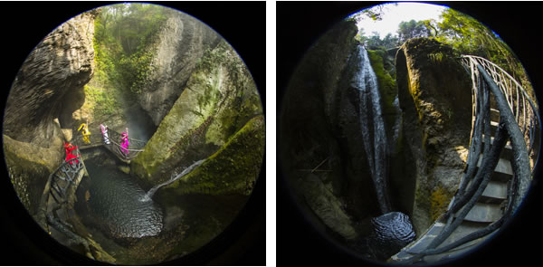 走在吊橋中間,必須保持自身的平衡方能安全通過,不然就會在吊橋上搖擺不定。走出仙女峽谷,往下看,深不見底,七潭七瀑在奇險之中不乏壯觀,這里曾發(fā)生過跳潭救女的故事。
