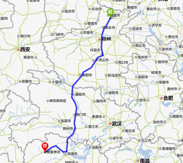 左右,沿途經過鶴壁——新鄉(xiāng)——鄭州——平頂山——南陽——襄陽——荊門——荊州——常德(也可以走國道經澧縣、石門縣)——慈利——張家界。