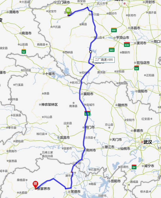 洛寧去張家界自駕車自助游線路圖全程高速):