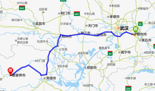 左右,沿途經過鄂州——仙桃市——潛江市——荊州市——常德(也可以走國道經澧縣、石門縣)——慈利——張家界。