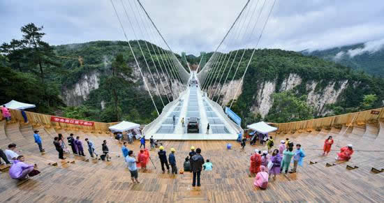 張家界大峽谷玻璃橋位于湖南省的張家界大峽谷景區(qū)栗樹(shù)埡和吳王坡區(qū)域內(nèi),為一座景觀橋梁,兼具景區(qū)行人通行、游覽、蹦極、溜索、T臺(tái)等功能。主跨430米,一跨過(guò)峽谷,橋面長(zhǎng)375米,寬6米,橋面距谷底相對(duì)高度約300米。這座全透明玻璃橋長(zhǎng)度、高度位居世界第一玻璃橋建成后,將成為世界首座斜拉式高山峽谷玻璃橋;并創(chuàng)下世界最高最長(zhǎng)玻璃橋、首次使用新型復(fù)合材料建造橋梁等多項(xiàng)世界之最。