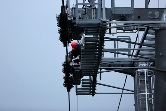 圖為正在對(duì)天子山索道進(jìn)行巡檢的工作人員